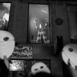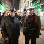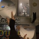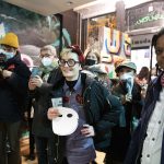 In a second act, flanked virtually by Nadya Tolokonnikova and Nika Nikulshina of Pussy Riot, ORLAN employed cut-out face-masks of the same image of her vulva. The odd choreography of Tolokonnikova’s “SEXIST” in the left vitrine, ORLAN’s imposing high-haired figure in the centre, and Nika Nikulshina seen alternatively raising the vulva-mask to her face, and charging the FIFA World Cup Final in Moscow on the right (the famous Pussy Riot intervention), was mirrored and amplified by the vulva-mask-wearing flashmob of dancers and the audience in the street.