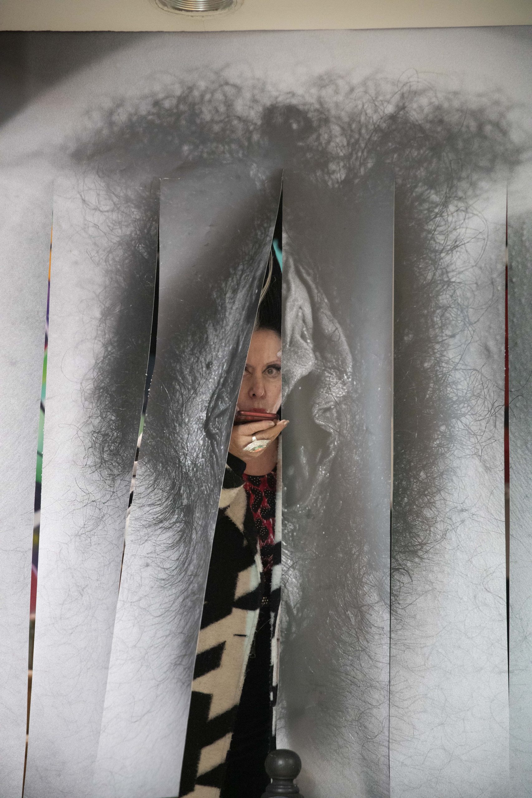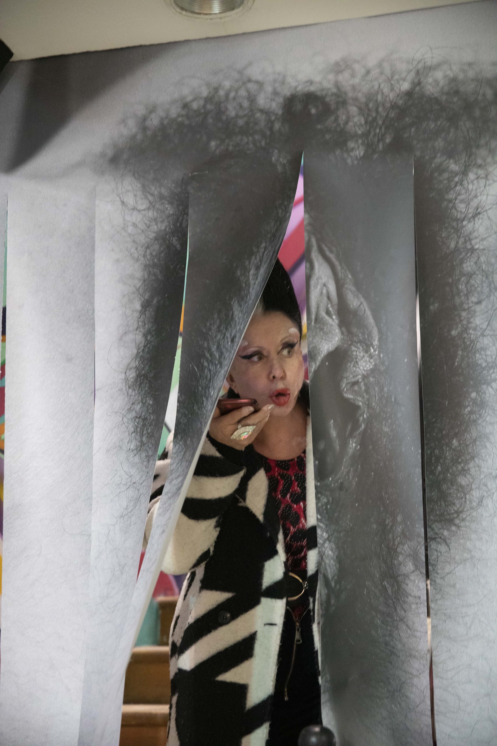 ORLAN emerges through a print of her vulva at 210 Rue Saint Denis
