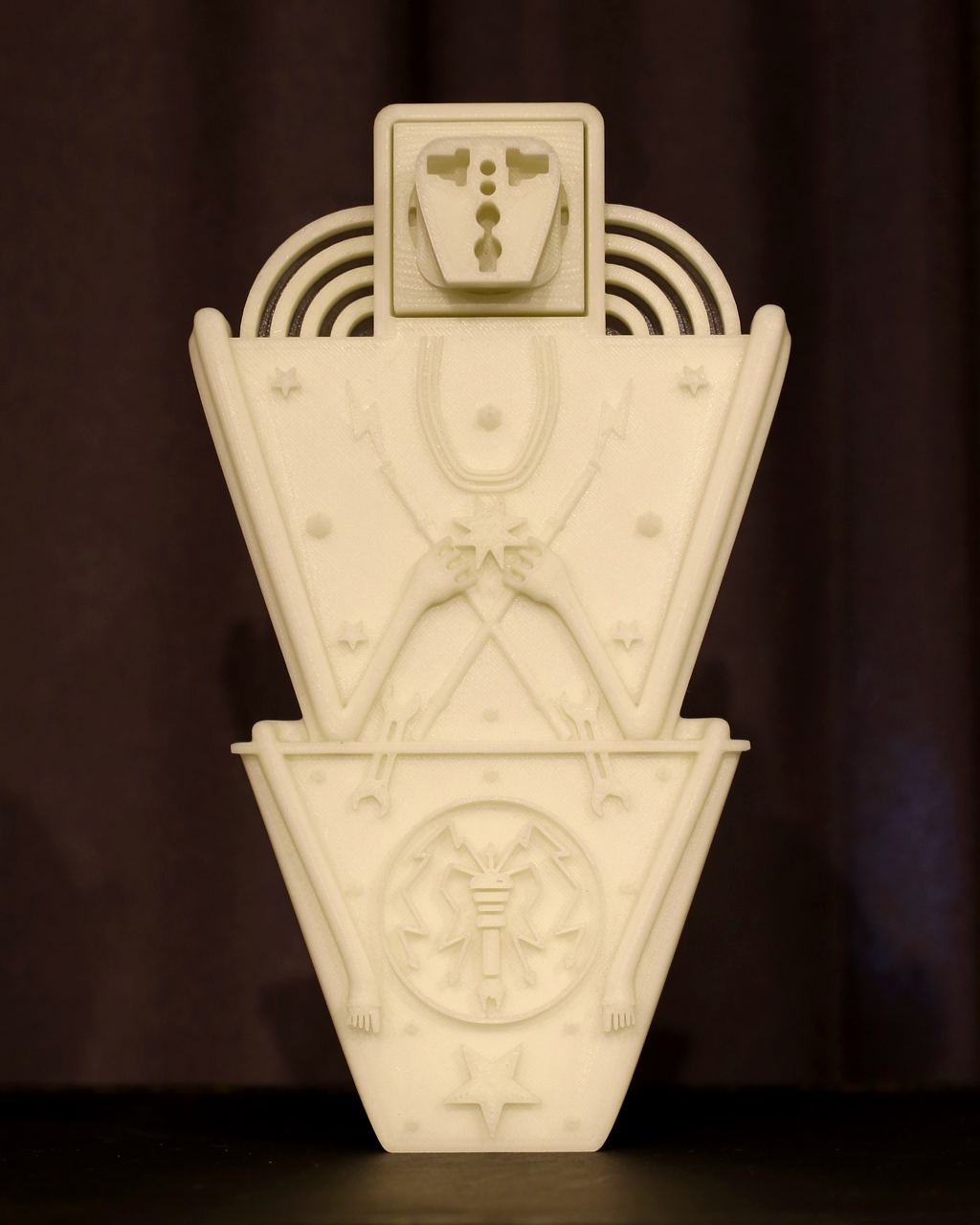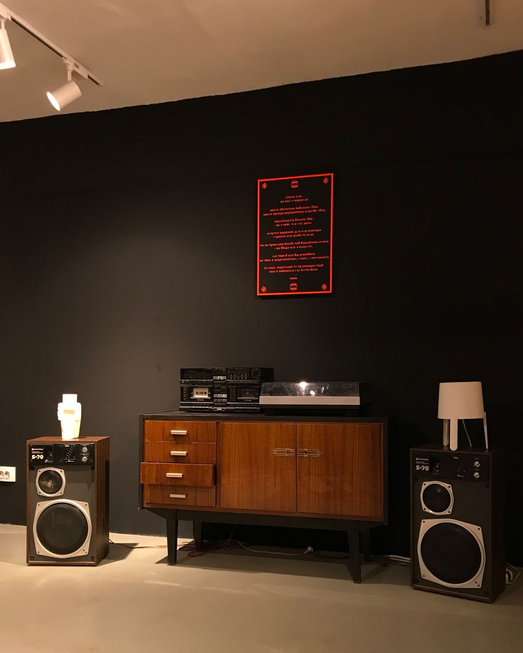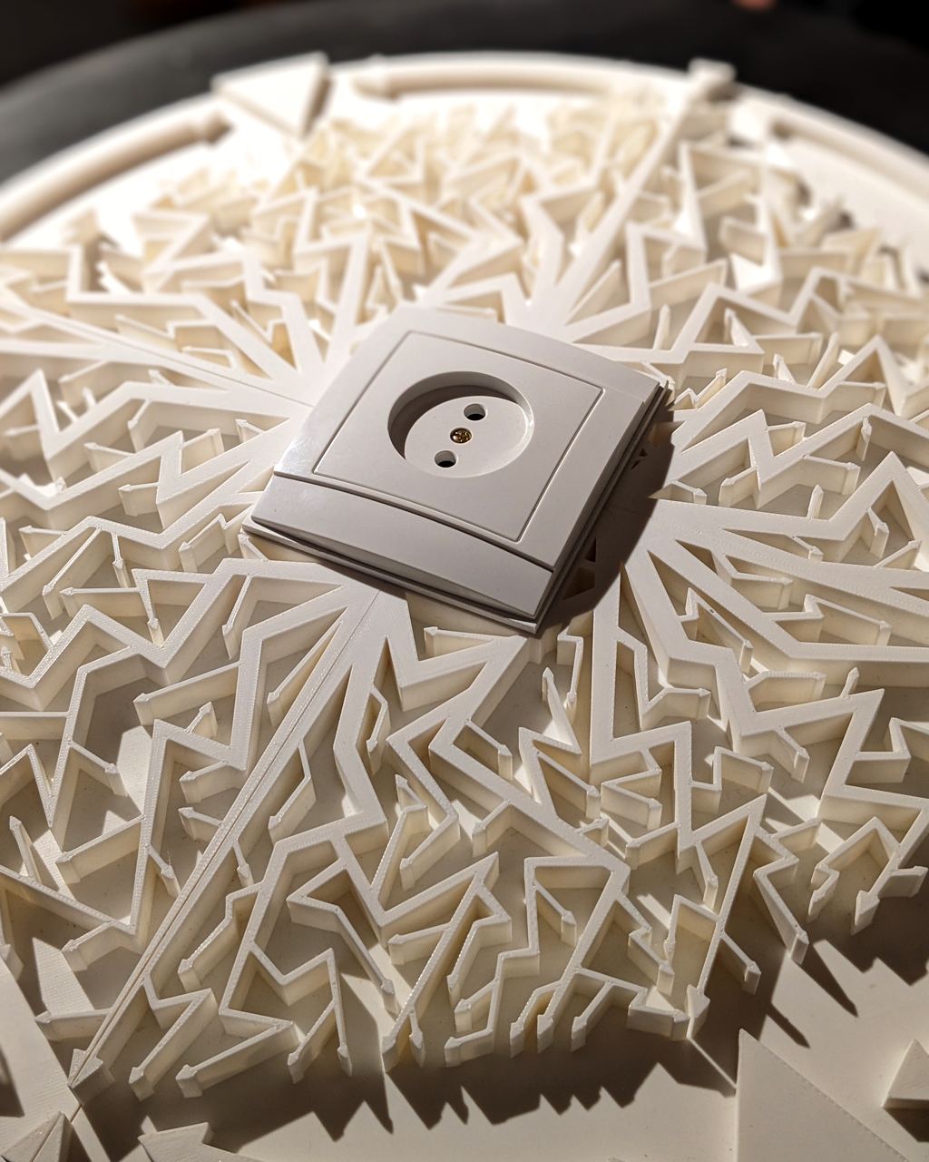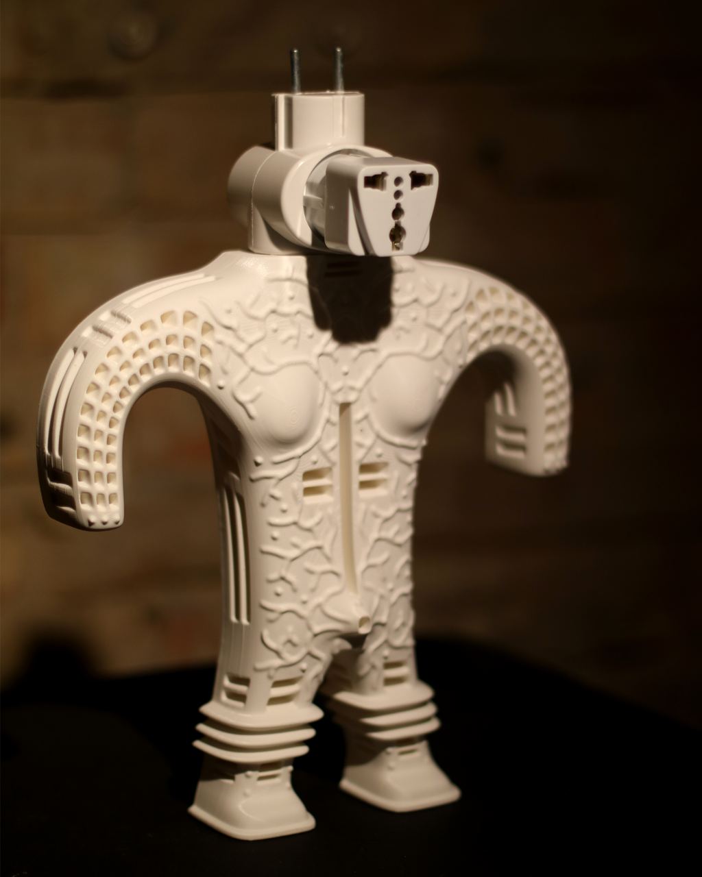 Volt Agapeyev: Votives are things offered as a gift to a deity for healing or fulfillment of some wish. The use of votive objects remains a sacred gesture and a softened form of sacrifice. Voltives are a transformed version of this ritual. Each sculpture is a kind of amulet capable of warding off future blackouts. Speculative sacredness finds a place in the combination of archaic forms and various elements of modern electrical networks.